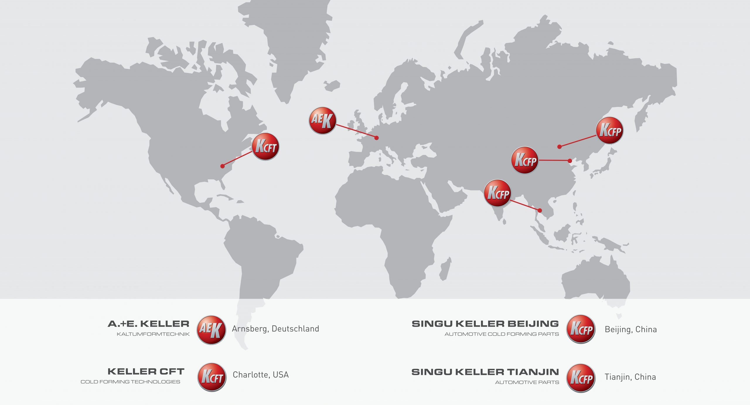 The Keller Group has five locations on three continents. These include the Headquarter A. + E. Keller in Arnsberg (Germany), Keller Cold Forming Technologies in Charlotte (USA), Beijing Singu Keller Automotive CFP in Beijing (China) and in Siracha (Thailand), as well as Tianjin Singu Keller Automotive Parts in Tianjin (China). The Keller Group employs a total of approximately 450 people.